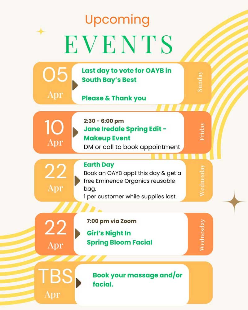 Are you running low on your products? OAYB would like to help you stay on top of your skin care and self care in between visits. We have Eminence Organic Skincare, Jane Iredale Mineral Makeup, DoTerra essential oils, Blew candles, Rapt Sugar Scrubs, and Dirdy Birdy soaps and bath bombs.